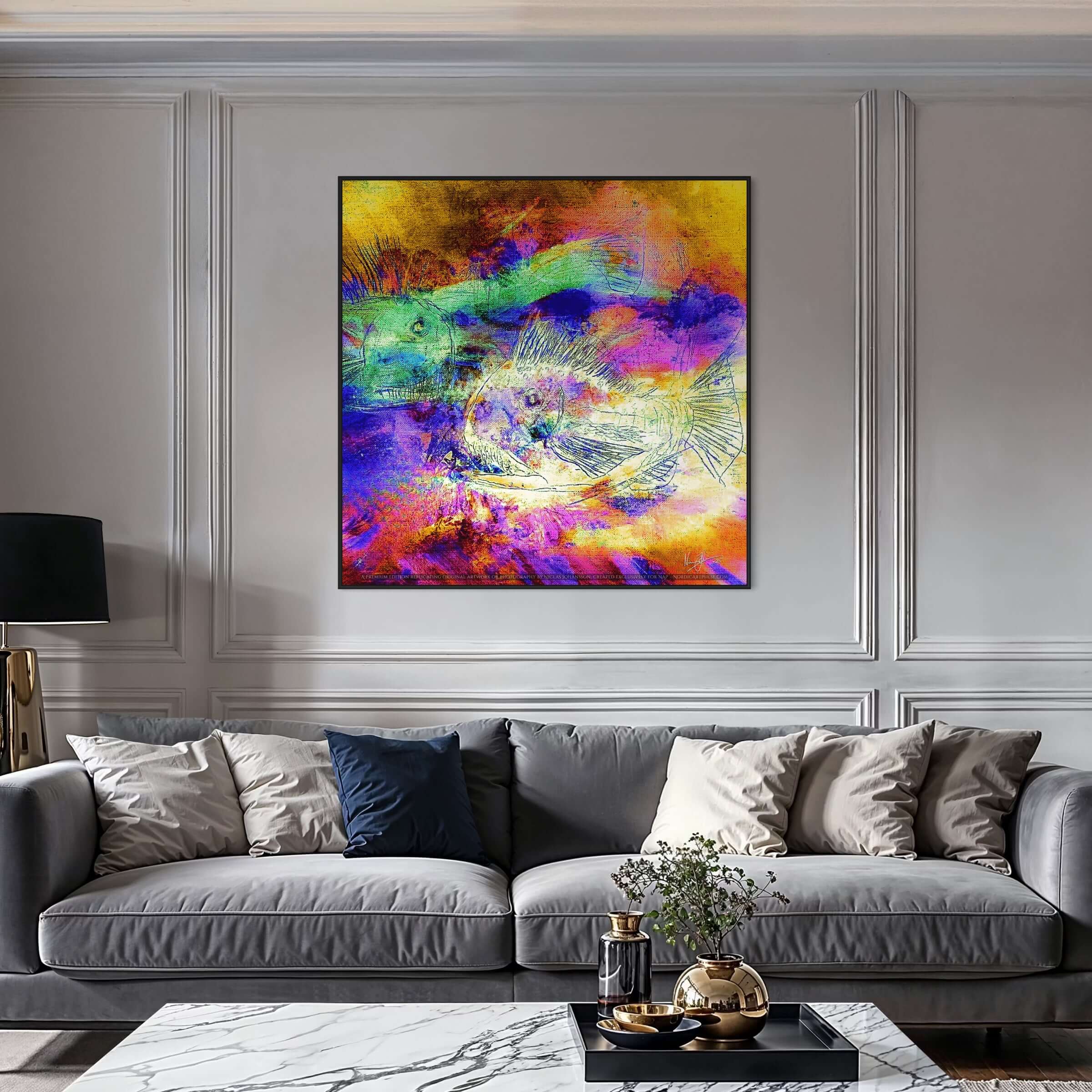 My goal was to capture the ethereal movement and colors reminiscent of cosmic phenomena, juxtaposed with the familiar forms of aquatic life. The fish, rendered in detailed linework, are presented as conduits or navigators through this celestial space.