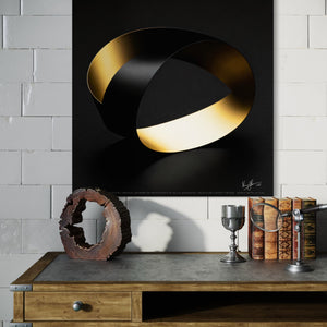From the artist's perspective, "Double Loop" is a study in contrasts, a visual exploration of infinity and the interplay between light and shadow. The piece embodies a minimalist aesthetic, where the simplicity of form becomes the focal point. The smooth, flowing lines of the Mobius strip evoke a sense of continuous motion and timelessness, reflecting an unending journey. The use of black and gold creates a striking dichotomy, symbolizing the duality of light and dark, value and void.