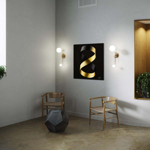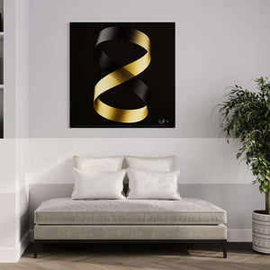 This artwork, "Ethereal Infinity," is a visual exploration of the continuous dance between contrasting elements. It is a representation of the interconnectedness of opposites: light and shadow, gold and black. The primary focus is on a ribbon, a symbol of flow and continuity, gracefully twisting and turning against a deep black background.