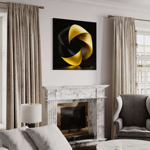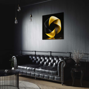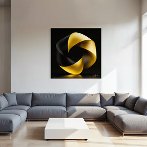 As an artist, I envisioned a piece that embodies both elegance and complexity. This artwork is a captivating exploration of form and light, where a continuous ribbon twists and turns to create a mesmerizing three-dimensional knot. The design plays with the interaction of contrasting colors: a rich, deep black intertwines with the radiant, lustrous gold.